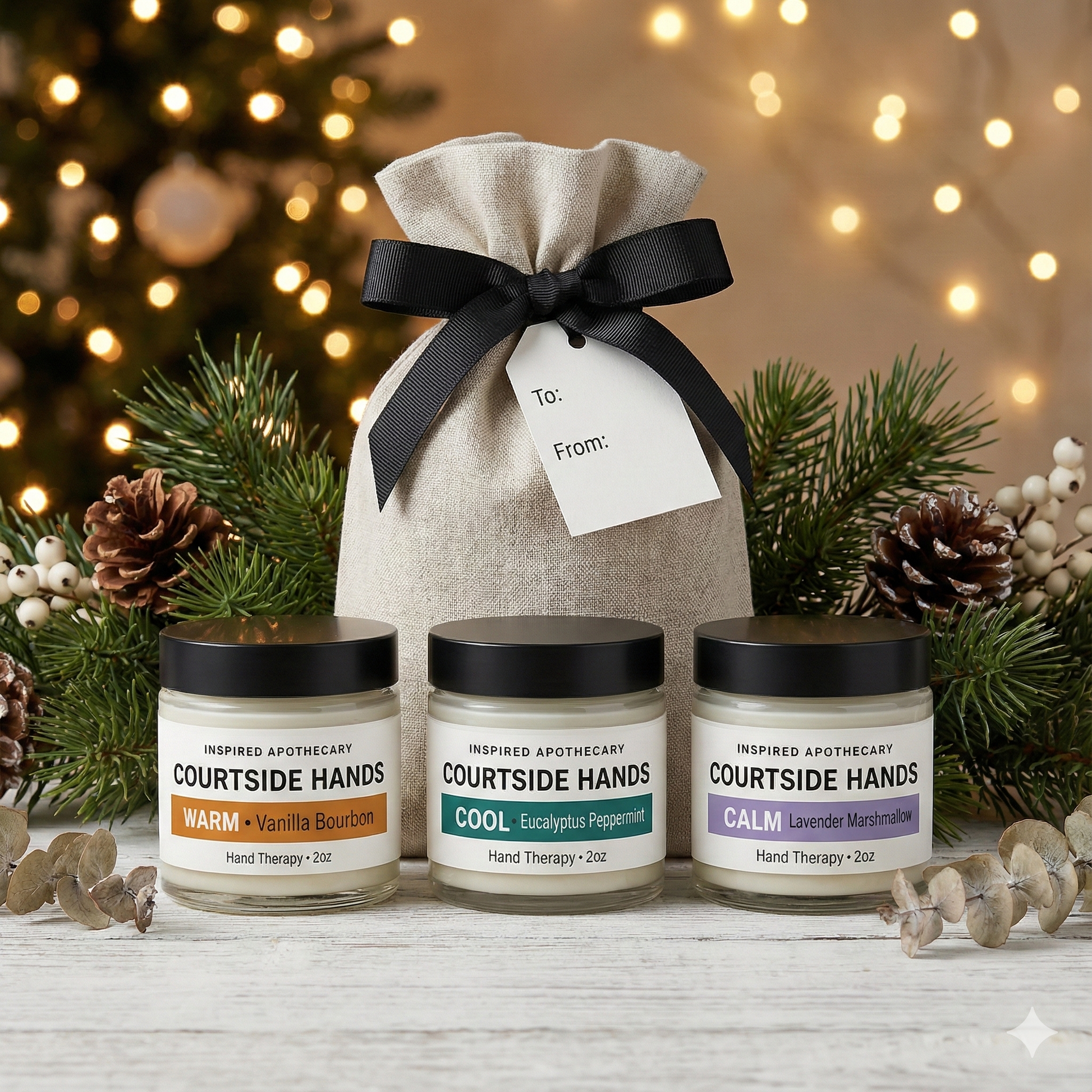 Designed with athletes, sports families, and on-the-go lifestyles in mind, The Courtside Hands Collection delivers hydration and relief when you need it most. This trio features Warm (Vanilla Bourbon) for comfort, Cool (Eucalyptus Peppermint) for refresh and recovery, and Calm (Lavender Marshmallow) for unwinding after long days. A clean, modern set that fits perfectly in gym bags, backpacks, and holiday gift lists.